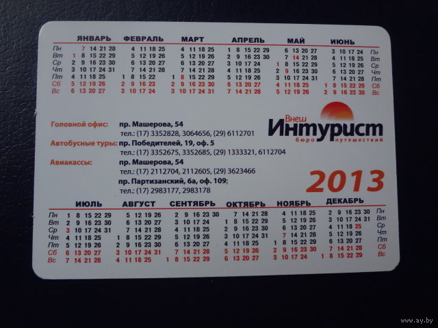 Календарик 2013 г. Интурист. Бюро путешествий.