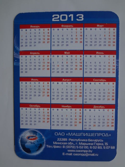 Календарик 2013 г. ОАО Машпищепрод (Марьина Горка).