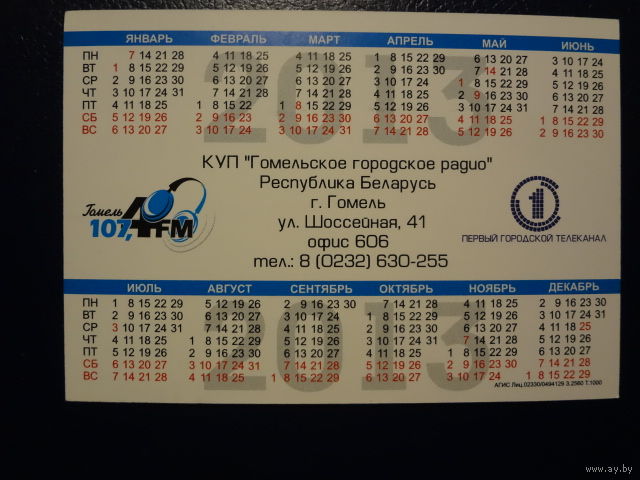 Календарик 2013 г. Первый городской телеканал. (Гомель).