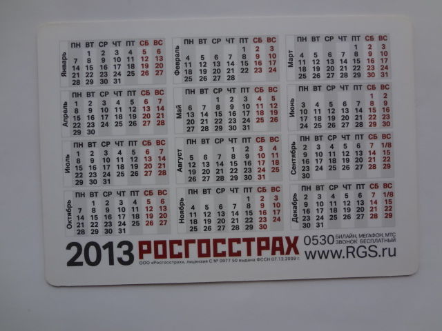 Календарик 2013 г. Росгосстрах. Заключайте договоры страхования квартир, дач, домов и домашнего имущества.