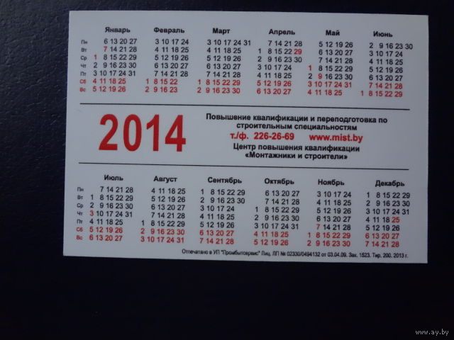 Календарик 2014 г. Центр повышения квалификации Монтажники и строители.