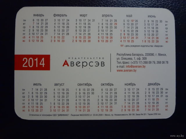 Календарик 2014 г. Издательство с 20-летней историей. Аверсэв.