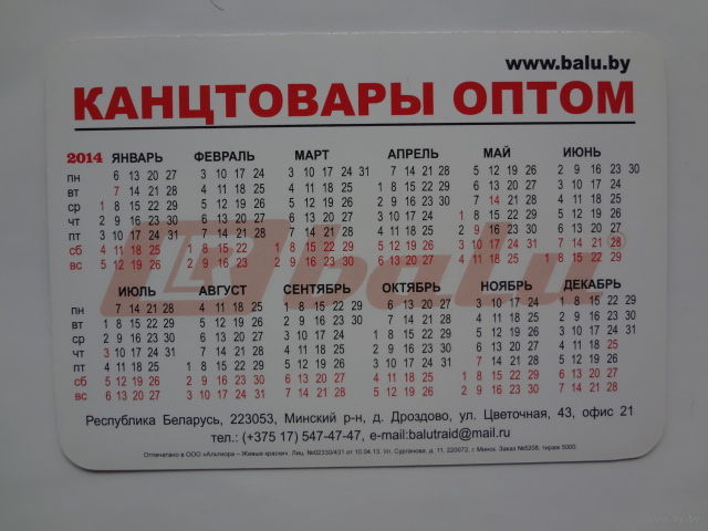 Календарик 2014 г. Канцтовары оптом.