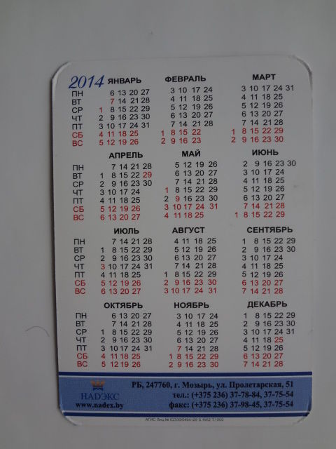 Календарик 2014 г. Мозырская швейная фабрика Надекс.