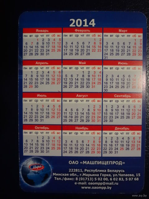 Календарик 2014 г. ОАО Машпищепрод. (Марьина Горка).