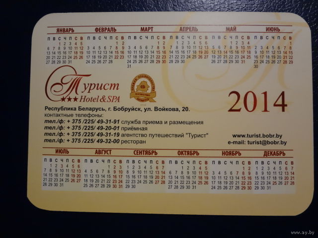 Календарик 2014 г. Турист. Отель, СПА. (Бобруйск).