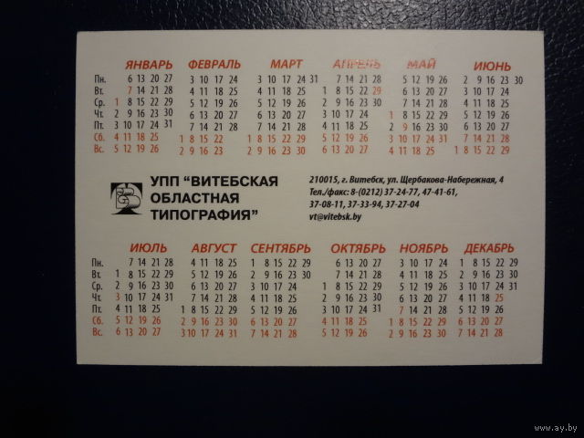 Календарик 2014 г. Витебская областная типография.