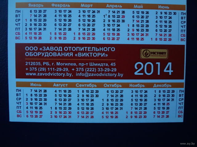 Календарик 2014 г. Завод отопительного оборудования Виктория. (Могилев).