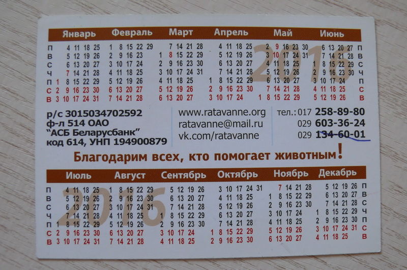Календарик, 2016, Общественное объединение "Спасение животных" (грустный пёс :(