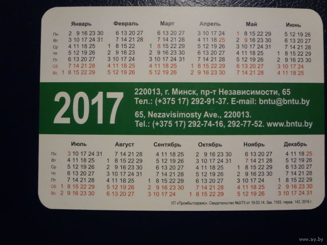 Календарик 2017 г. БНТУ.