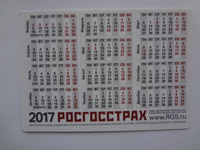Календарик 2017 г. Росгосстрах. Каско.
