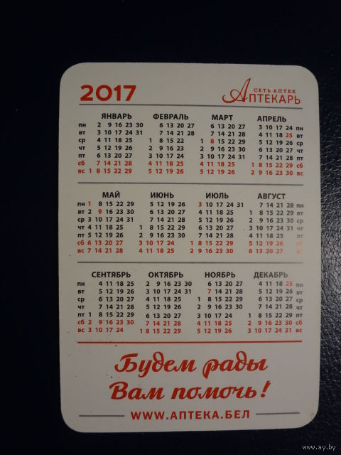 Календарик 2017 г. Сеть аптек Аптекарь. Будем рады Вам помочь!