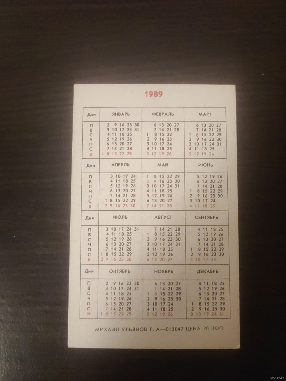 Календарик,артисты,ульянов,1989