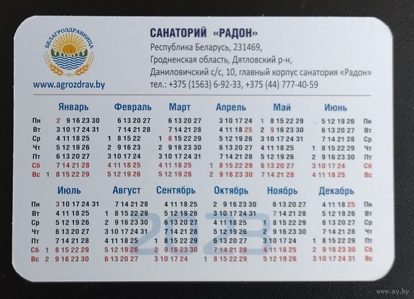 Календарик. Беларусь. Санаторий Радон. 2023.