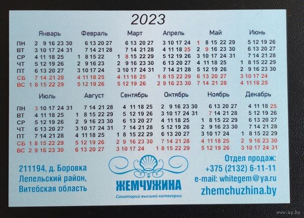Календарик. Беларусь. Санаторий Жемчужина. 2023.