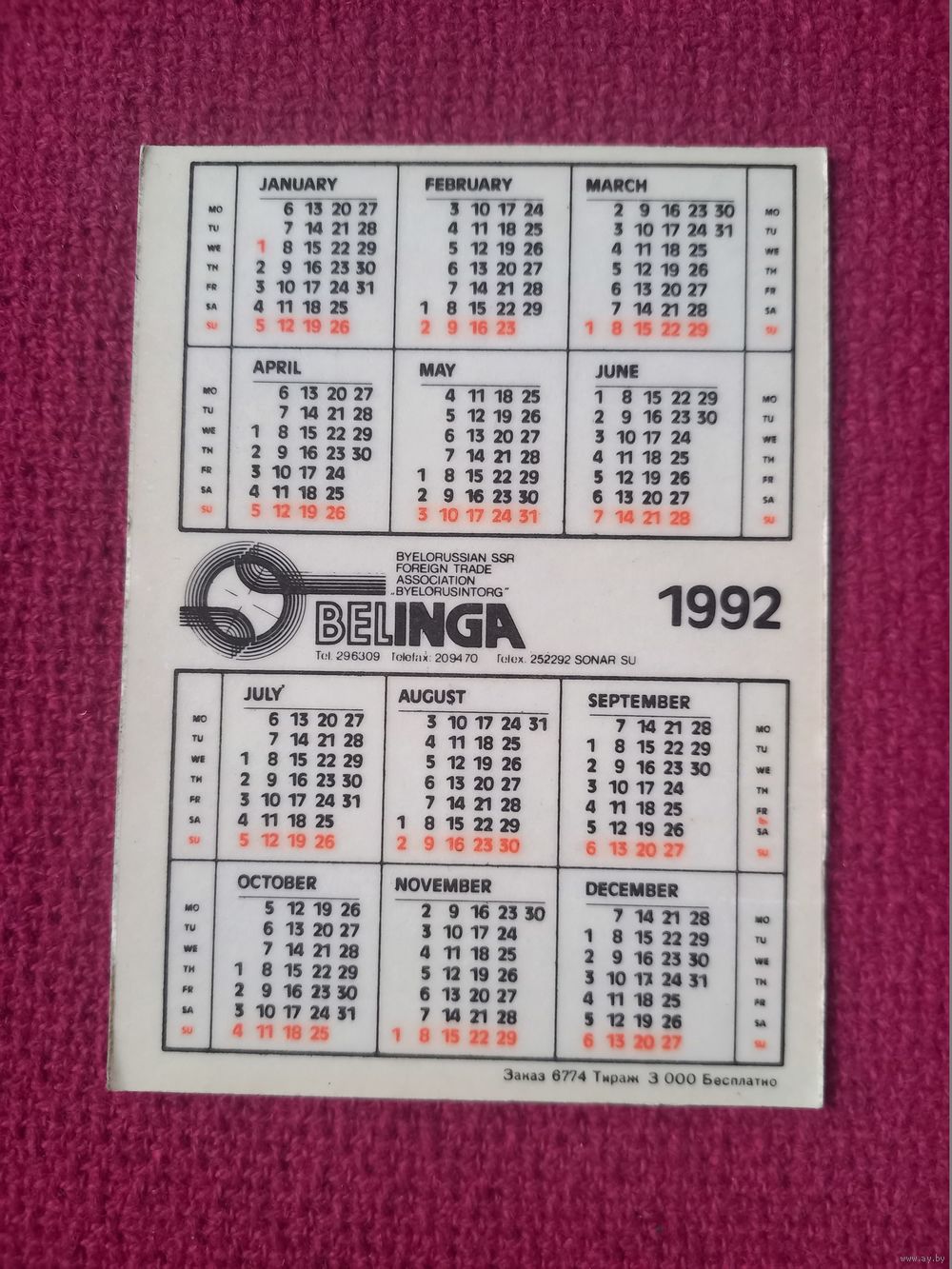 Календарик Belinga 1992 г.