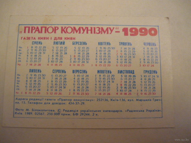 Календарик.ГАЗЕТА "Прапор Комунизму"-1990г