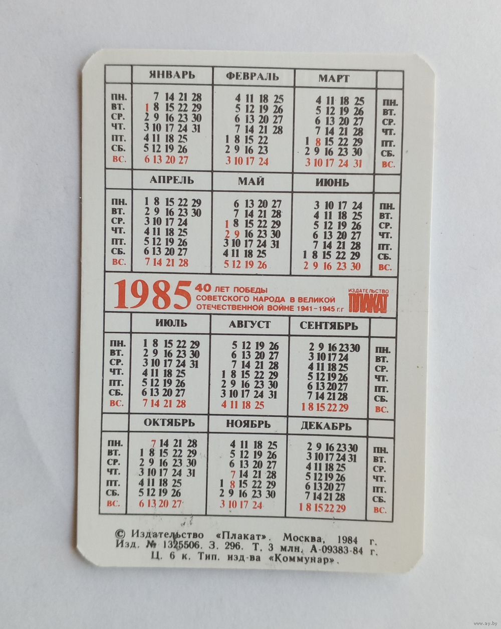 Календарик карманный 1985 год. Ленинград.