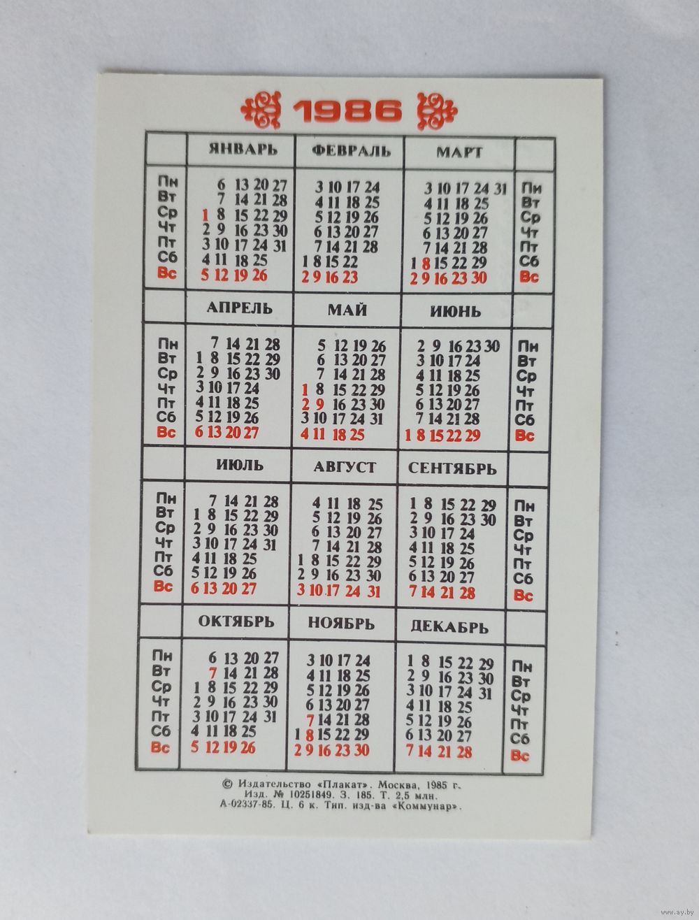 Календарик карманный 1986 год. Ашхабад.