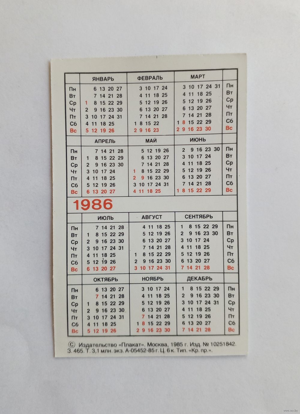 Календарик карманный 1986 год. Баку.