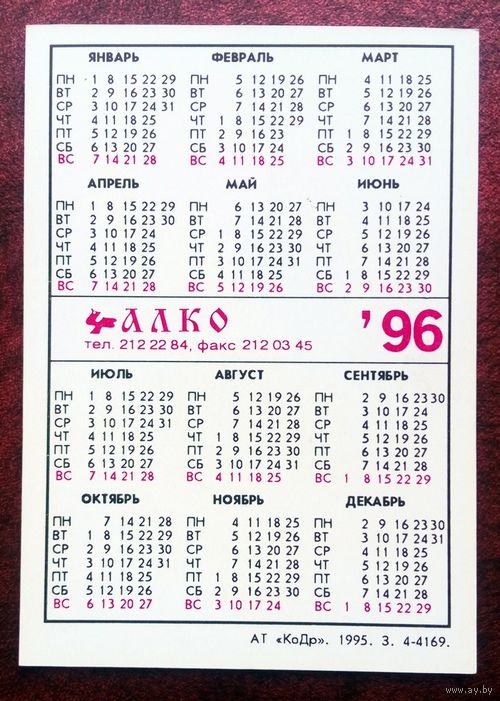 Календарик карманный. 1996 год Транспорт Автомобили