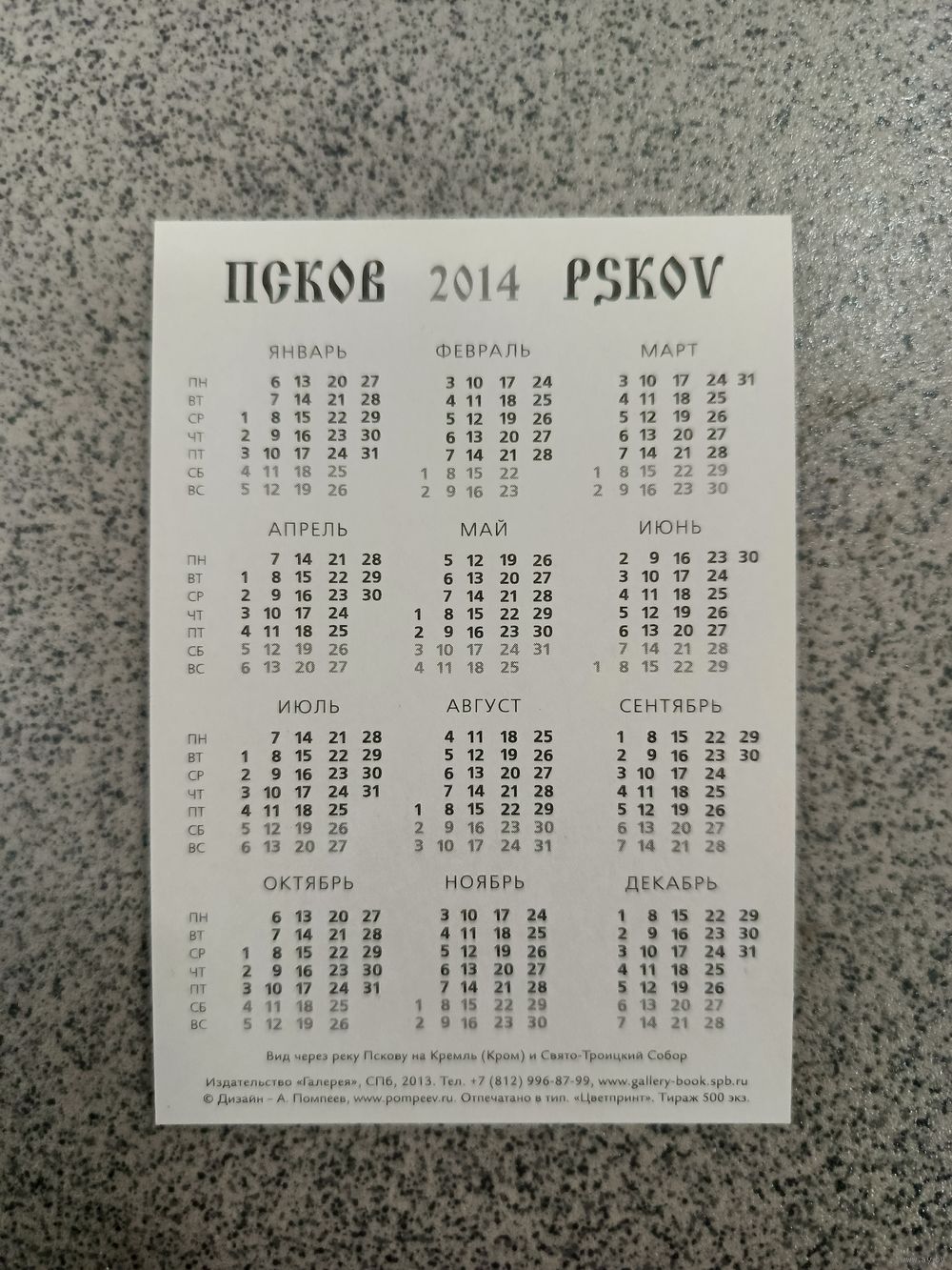 Календарик карманный 2014 Псков. Вид через реку Пскову на Кремль и Свято-Троицкий собор
