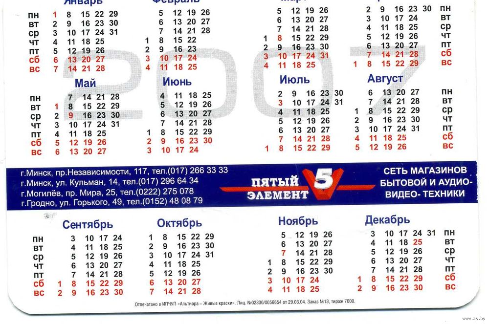 Календарик карманный 5 элемент 2007