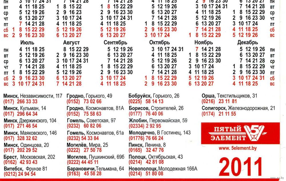 Календарик карманный 5 элемент 2011