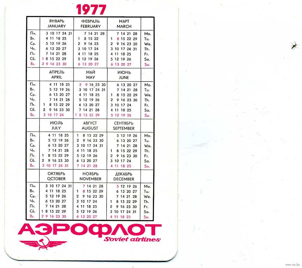Календарик карманный Авиация Аэрофлот 1977
