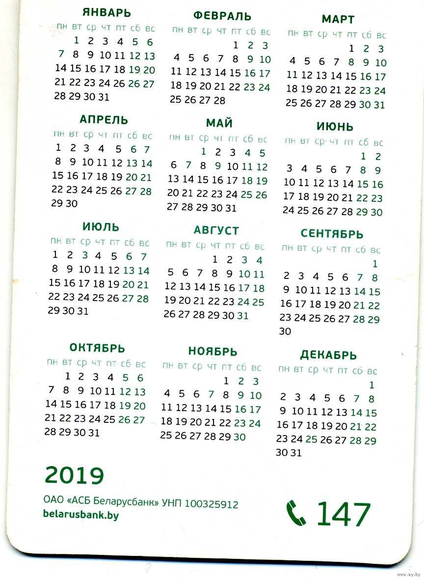 Календарик карманный Беларусбанк 2019
