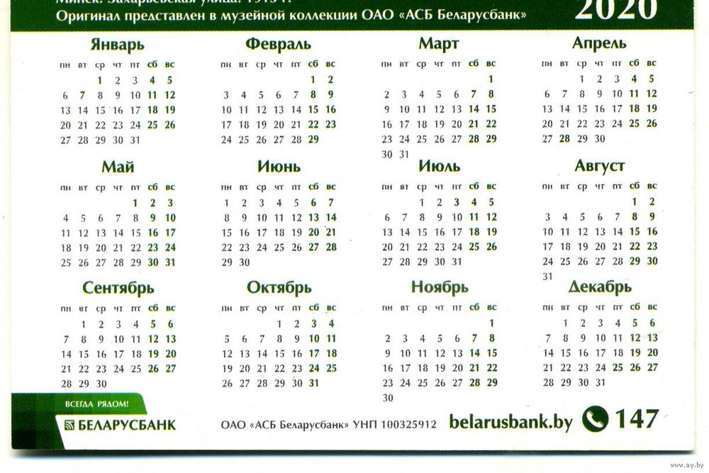 Календарик карманный Беларусбанк 2020