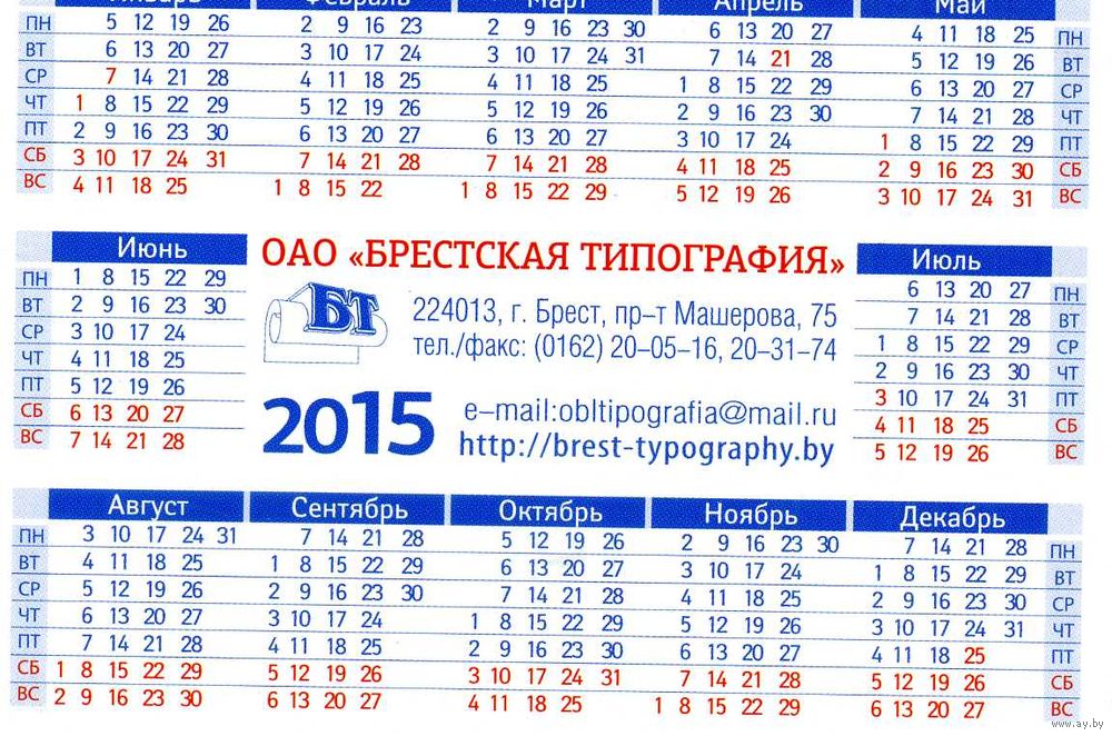 Календарик карманный Брестская типография 2015