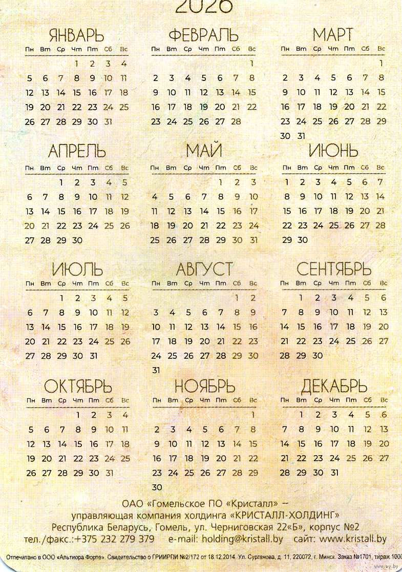 Календарик карманный ОАО Кристалл Гомель Ювелирные изделия 2026