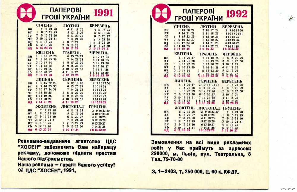 Календарик карманный Первые деньги Украины 10 гривен 1918