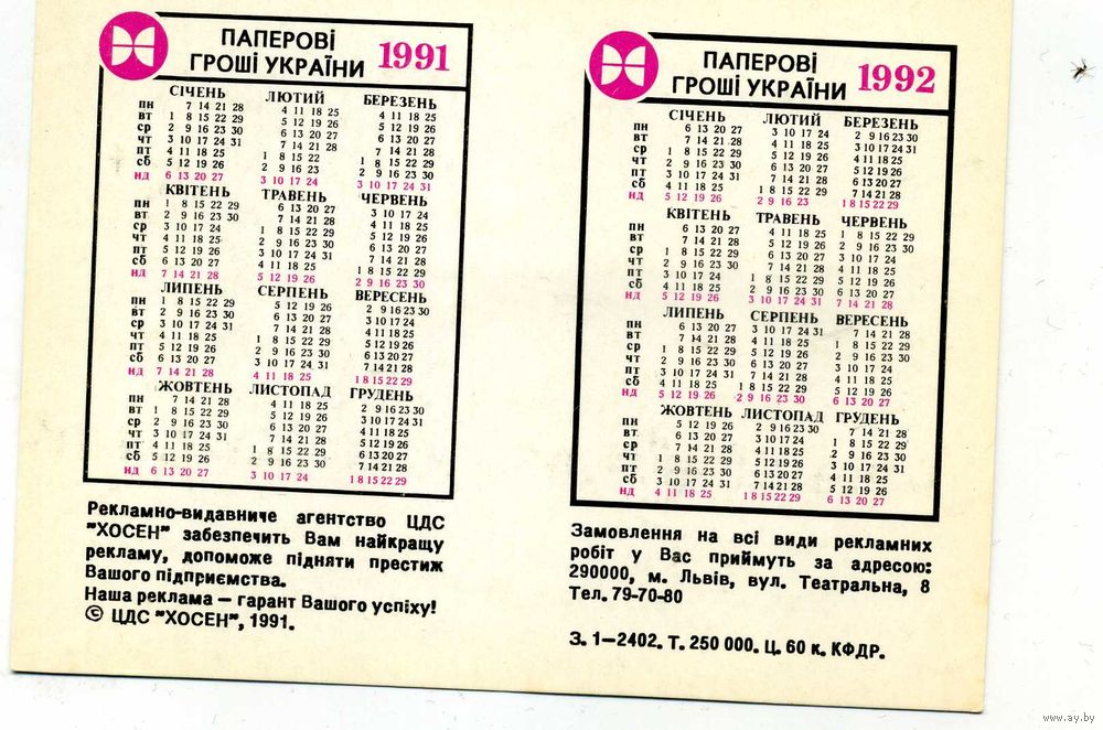 Календарик карманный Первые деньги Украины 100 гривен 1918