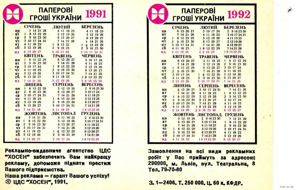 Календарик карманный Первые деньги Украины 1000 гривен 1918