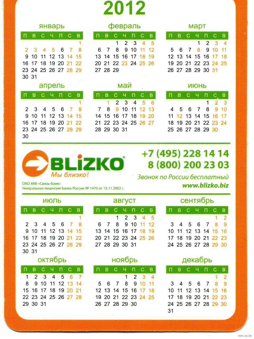 Календарик карманный Платежные системы BLIZKO 2012