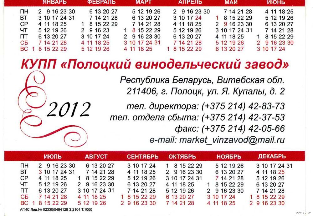 Календарик карманный Полоцкий винодельческий завод 2012