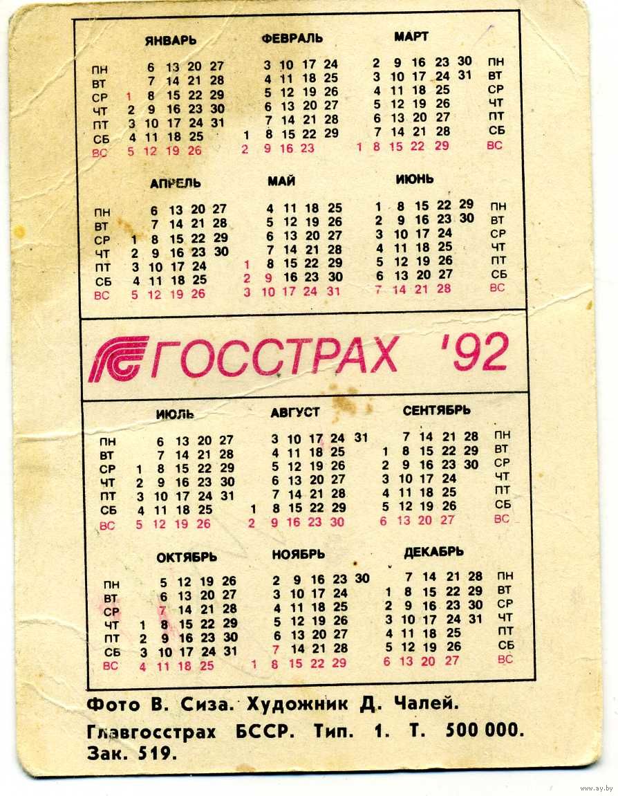 Календарик карманный Страхование Белгосстрах 1992