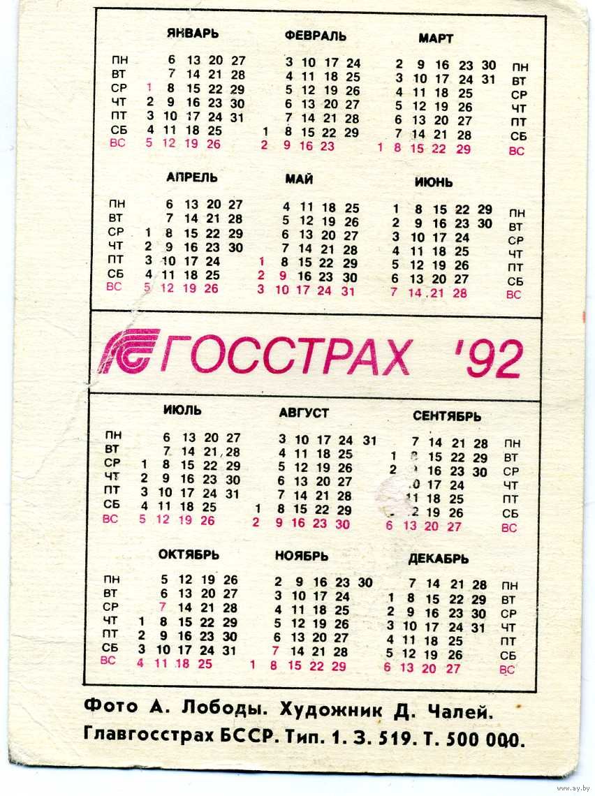 Календарик карманный Страхование Белгосстрах 1992