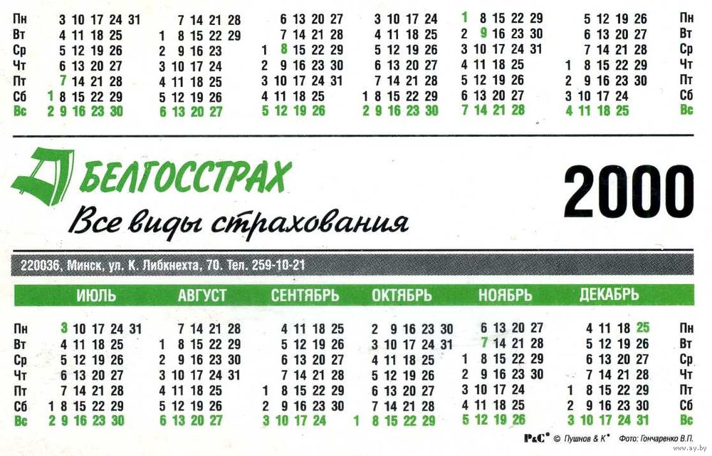 Календарик карманный Страхование Белгосстрах 2000