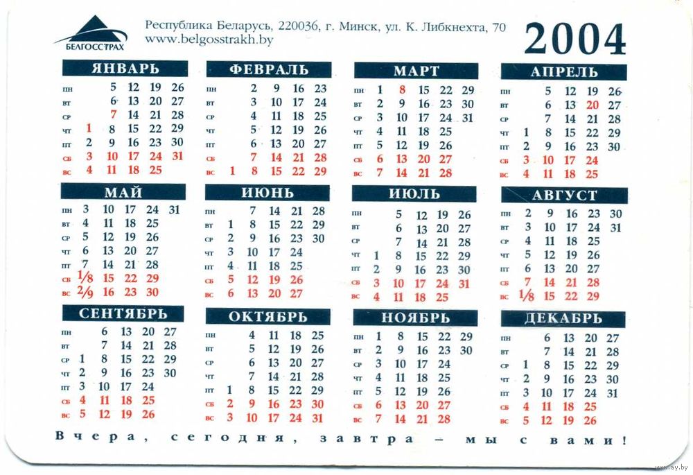 Календарик карманный Страхование Белгосстрах 2004