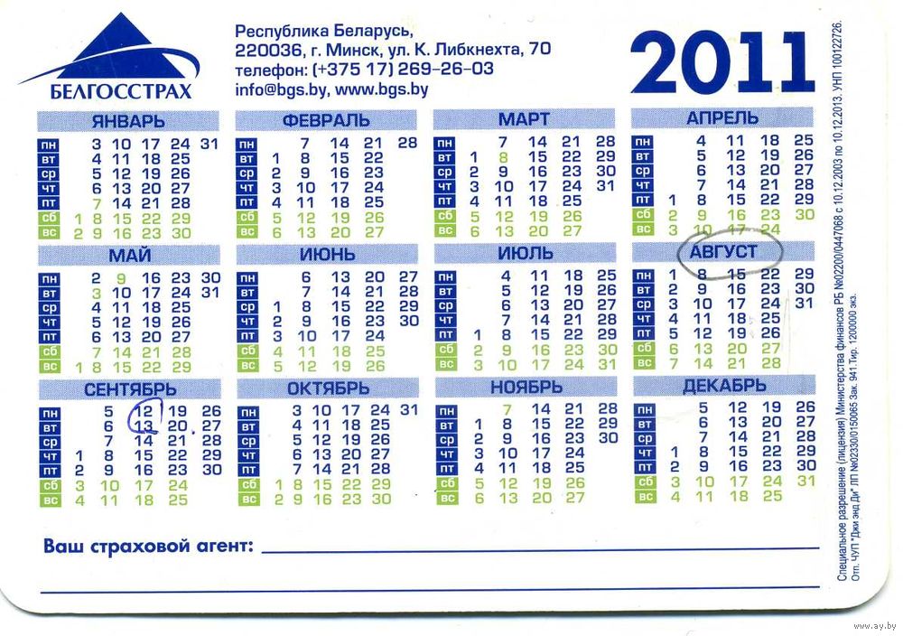 Календарик карманный Страхование Белгосстрах 2011
