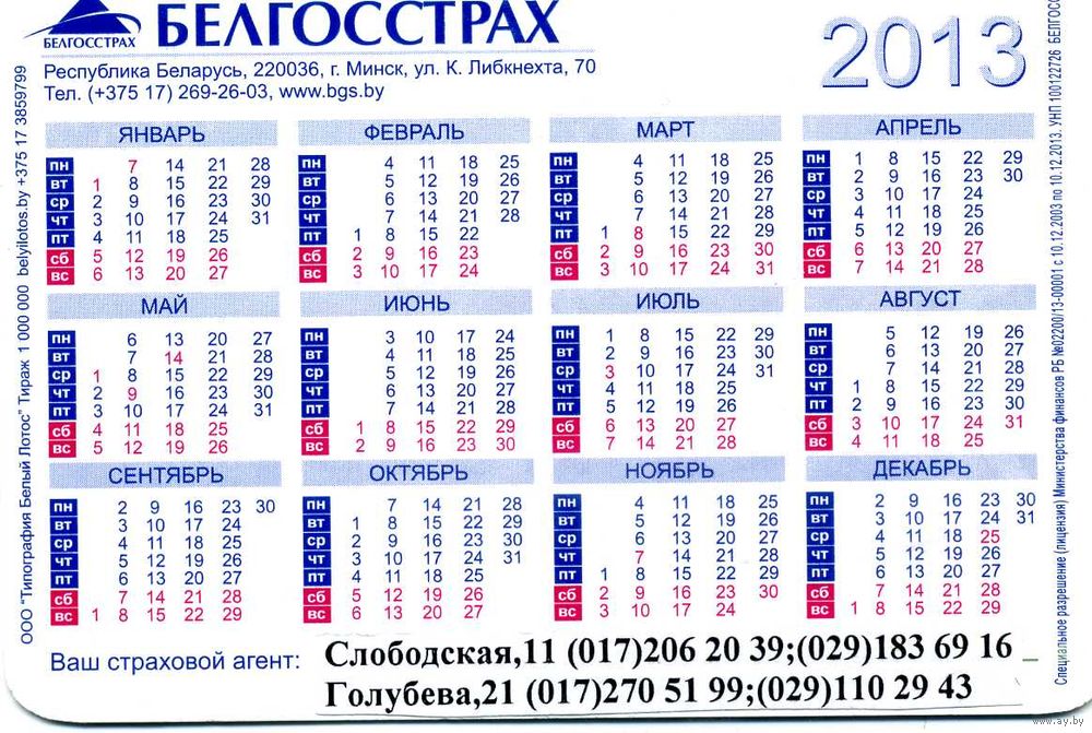 Календарик карманный Страхование Белгосстрах 2013