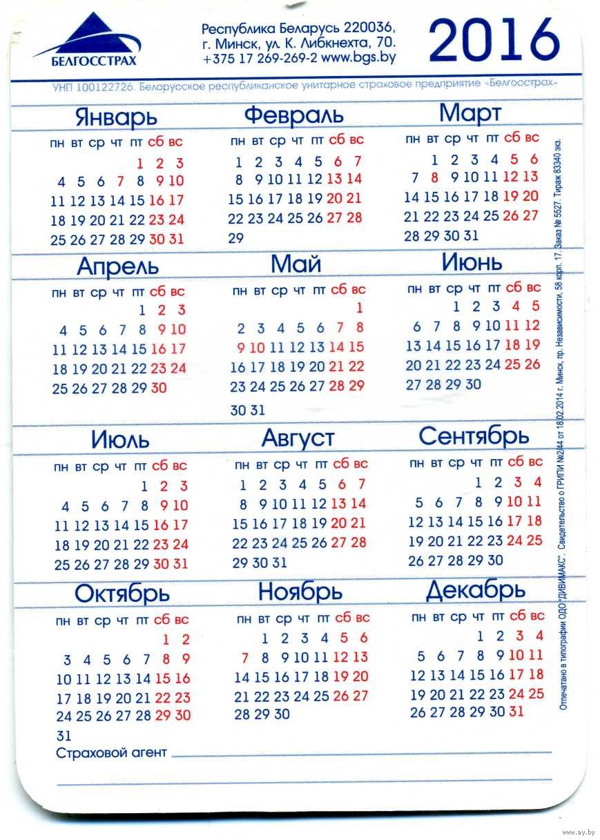 Календарик карманный Страхование Белгосстрах 2016