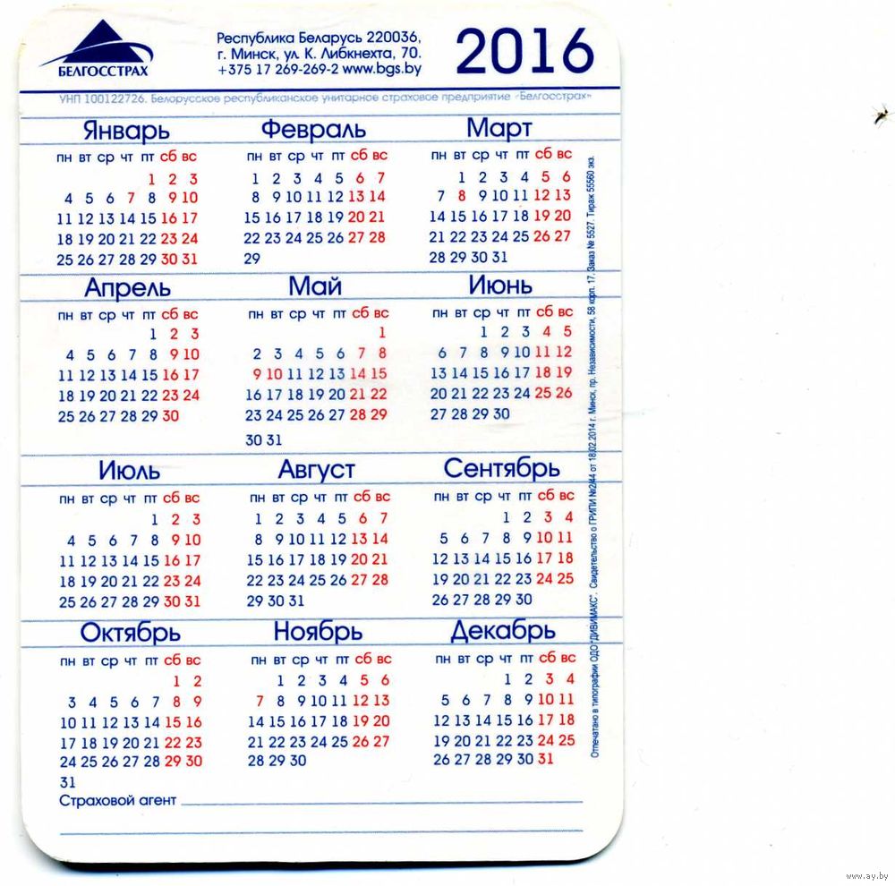 Календарик карманный Страхование Белгосстрах 2016