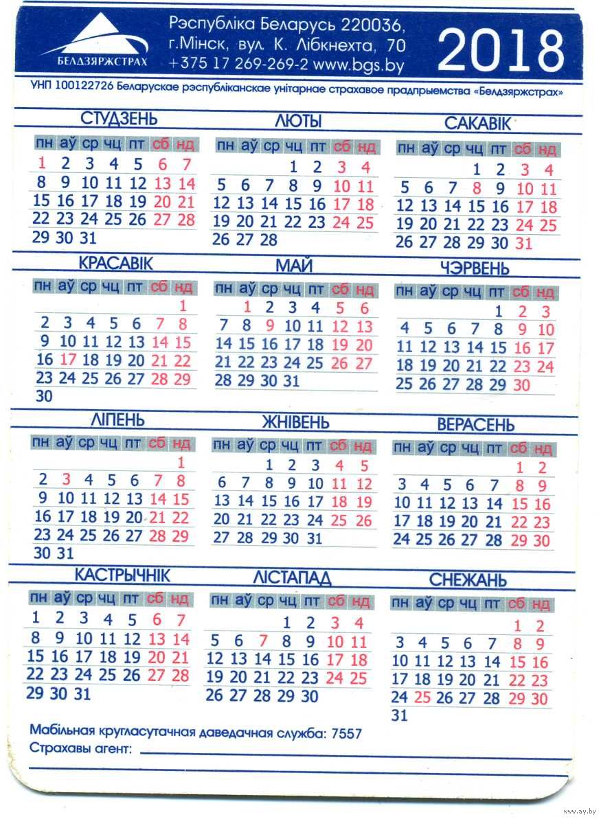 Календарик карманный Страхование Белгосстрах 2018