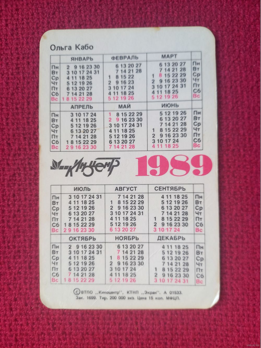 Календарик кинотеатр 1989 г. Ольга Кабо.