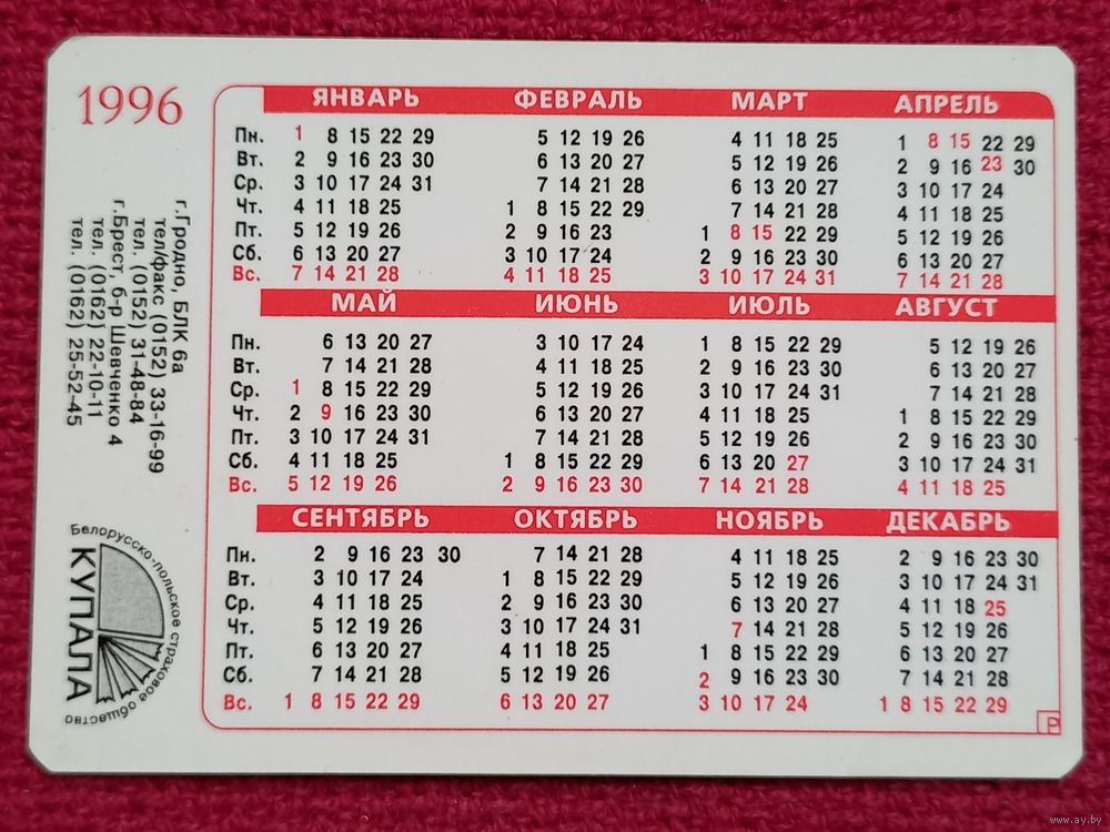 Календарик Купала. Страховое общество. 1996 г.