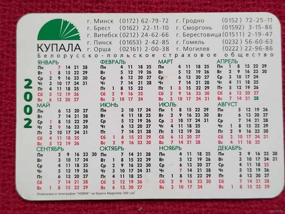 Календарик Купала. Страховое общество. 2002 г.